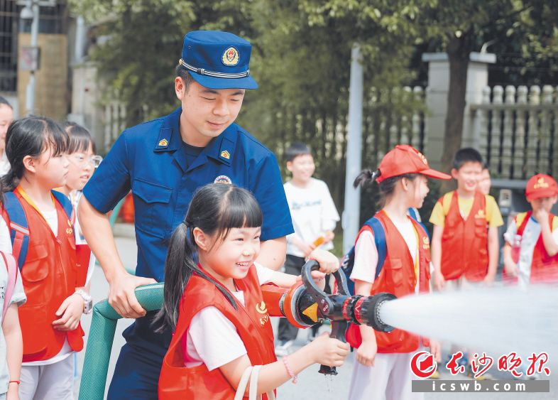 (在消防员指导下,校园小记者在学习使用消防器材。 长沙晚报通讯员 谢梦嘉 摄)