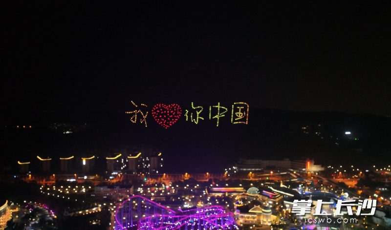 国庆期间,湘江欢乐海洋公园上演无人机表演。上百架无人机在夜空集结,通过精巧的编队与变幻,组合出“我爱你中国”等文字与图案,表达对祖国华诞的美好祝愿。通讯员 罗斌 摄