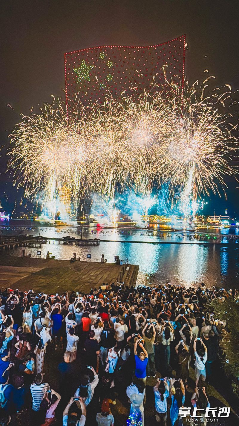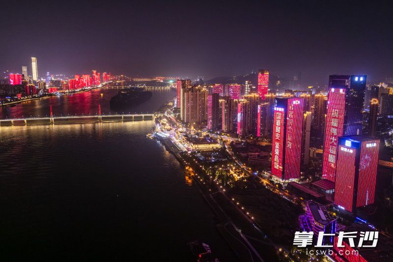 “一江两岸”灯光秀中的中国红映照湘江。长沙晚报全媒体记者 郭雨滴 摄