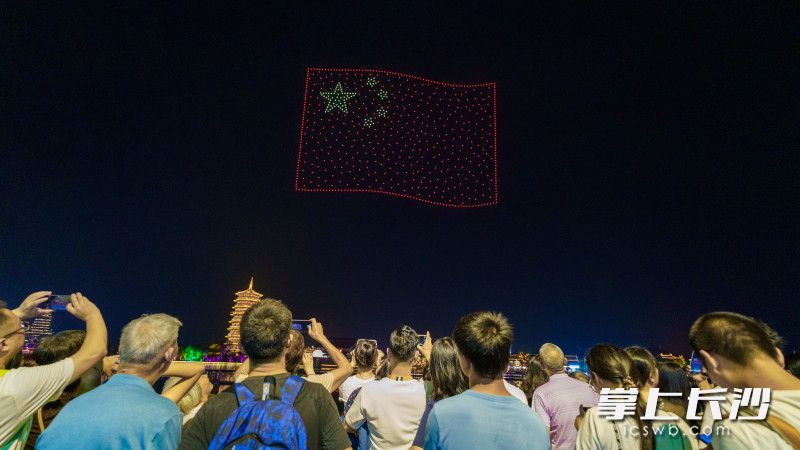 夜幕降临时,长沙铜官窑国风乐园上空的无人机在夜空中勾勒出“五星红旗”等震撼画面,引发游客阵阵惊叹。通讯员 叶友朋 摄