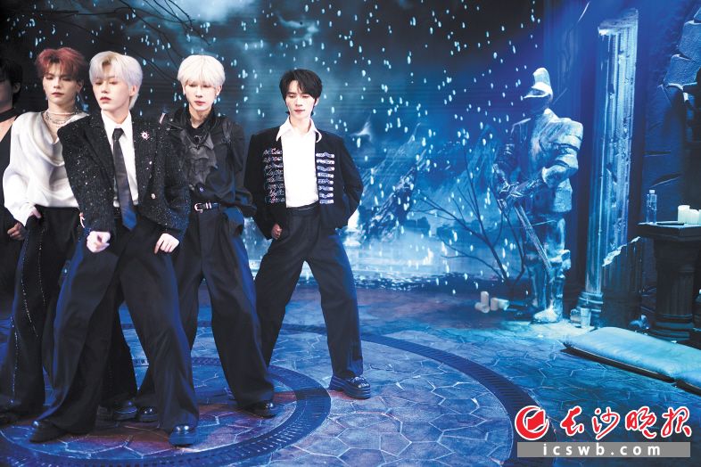 “2ND-爵迹”男团正在直播演出,组合成员均为舞蹈专业出身。