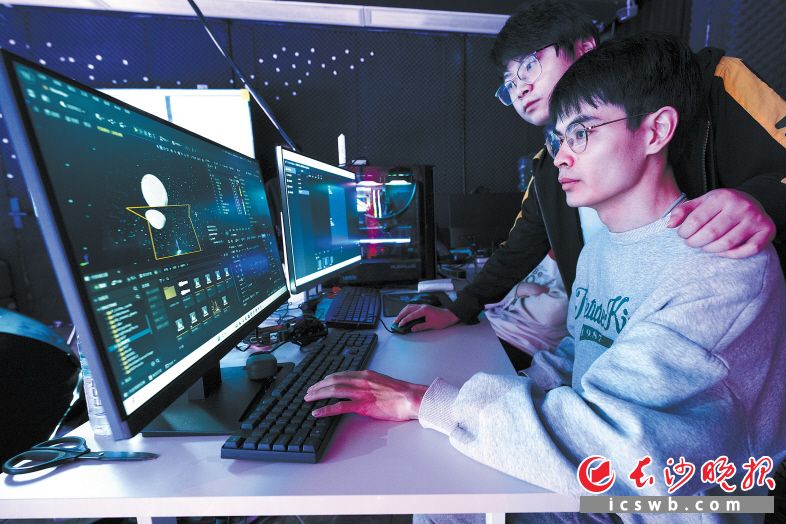 隔壁的直播间里,另一番“热身”同步展开:XR组组长紧盯着电脑屏幕,对设备进行最后的调试。这间仅几十平方米的直播间,由两块巨大的LED显示器折叠搭建而成,屏幕外布满白色原点——“这是XR技术的坐标点,也是实现沉浸效果的关键。”通过摄像机上的“定位器”,系统能实时识别摄像机角度,同步渲染后方屏幕画面,再匹配光源等因素,让摄像机中的人物与虚拟环境沉浸融合,呈现出极具视觉冲击的沉浸感。