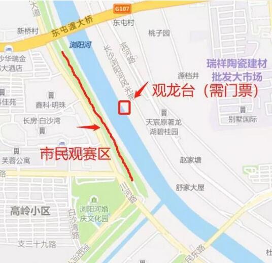 浏阳河大道远大路口至人民路口路段浏阳河西岸河堤为市民观赛区,可容纳观众总量约为20000余人。