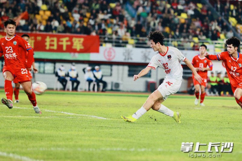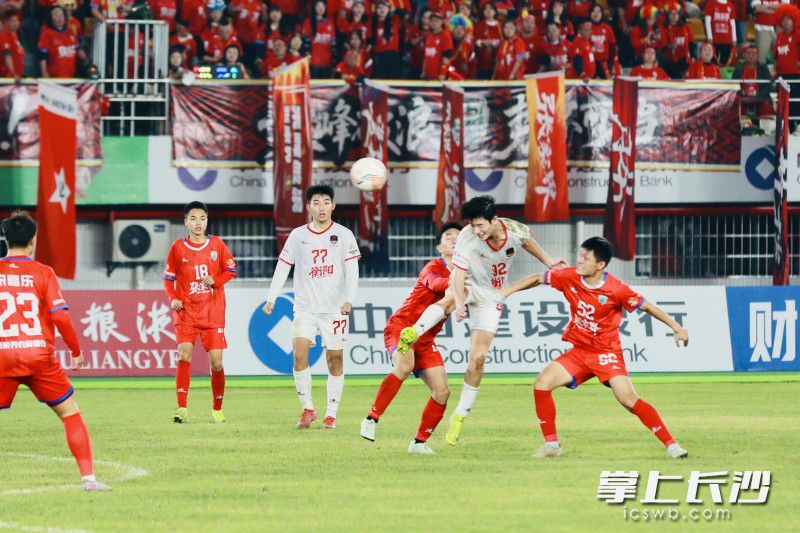 自第一轮取胜后,岳阳队4平2负,遭遇六轮不胜。此番主场面对湘西队,岳阳队势在必得。上半场伤停补时阶段,岳阳队从右路突破传中,22号杨楠抓住机会攻破湘西队大门。