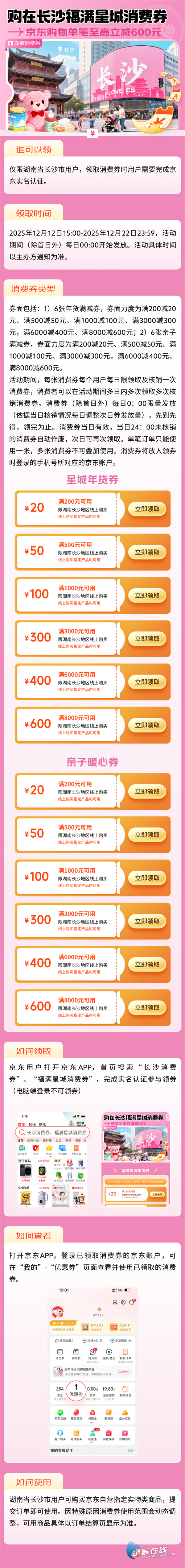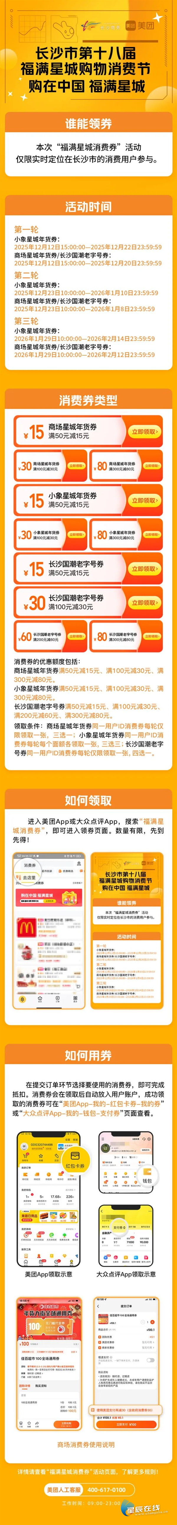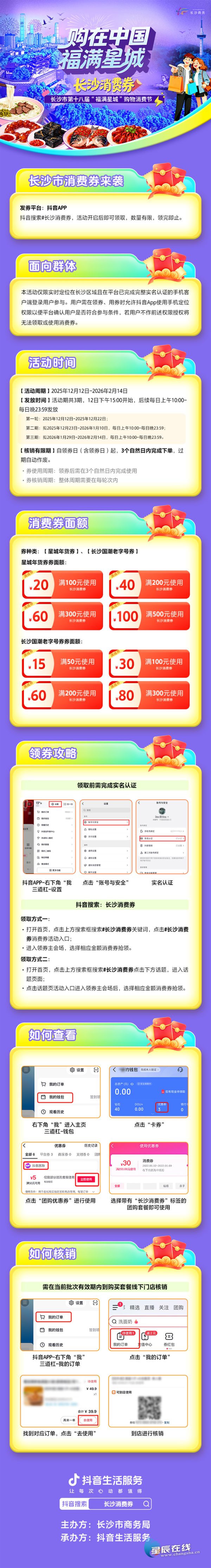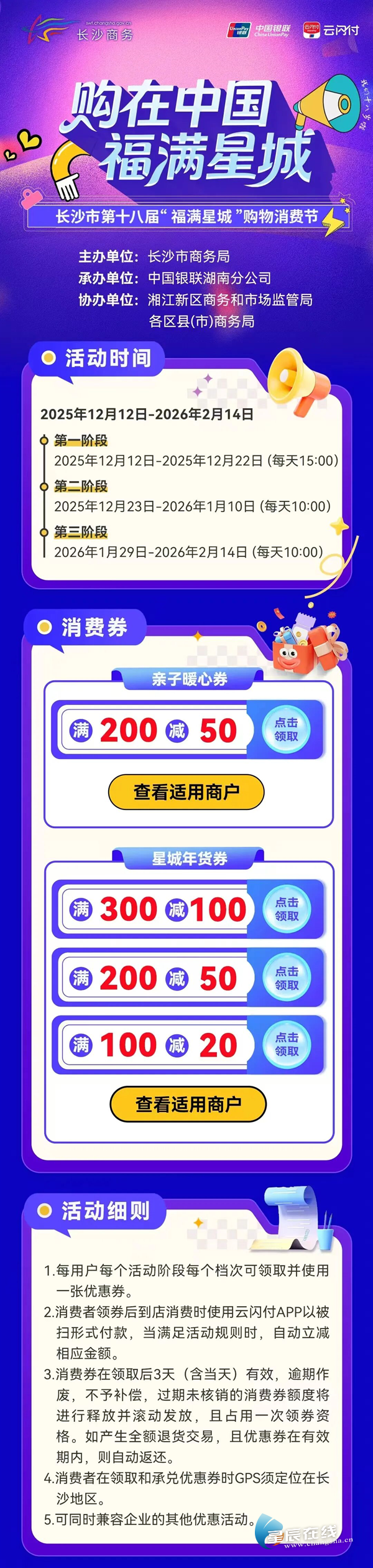 星辰在线12月12日讯(星辰全媒体记者 魏玮)2025年长沙市第十八届福满星城购物消费节正式启动。1000万元“福满星城”政府消费券正在云闪付APP、京东商城、美团、抖音四大平台同步火热发放中。